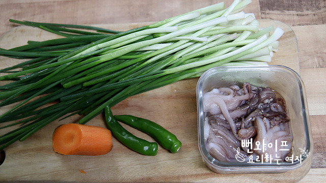 쪽파 두 줌 정도, 오징어, 당근, 청양 고추입니다.