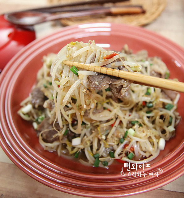 숙주가 살짝 덜 익었다 싶게 볶아내면 남은 열로 알맞게 숨이 죽어요.