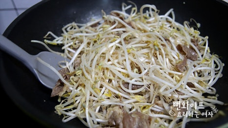 불이 약해서 오래 볶다 보면 고기도 질겨지고 숙주의 숨도 죽고 수분이 생기기 시작합니다.