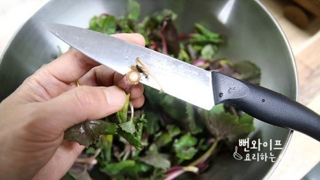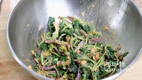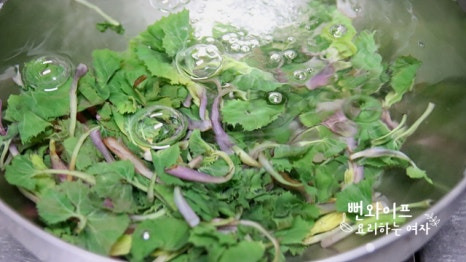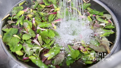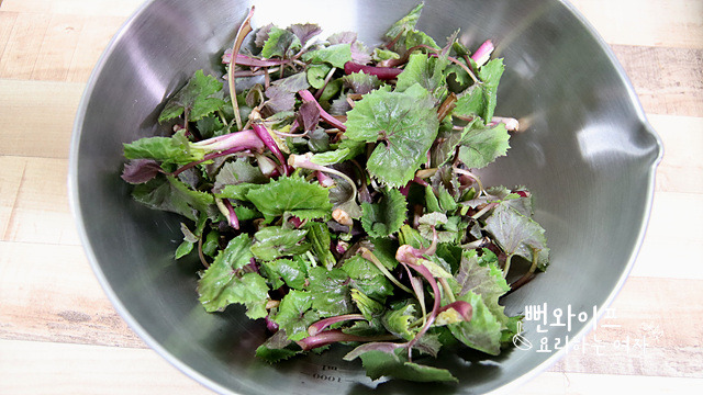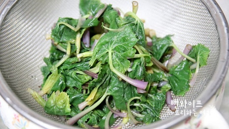 냉수에 헹궈서 물기를 빼줍니다. 쓴맛이 강하게 남아 있다면 물에 담갔다가 건지면 돼요.