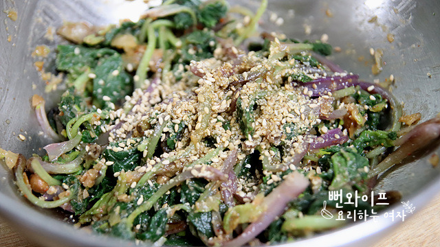 간을 보고 싱거우면 된장이나 간장을 추가해서 맞추고 참기름과 통깨는 반은 갈아서 넣고 고소한 맛을 올려 줍니다.