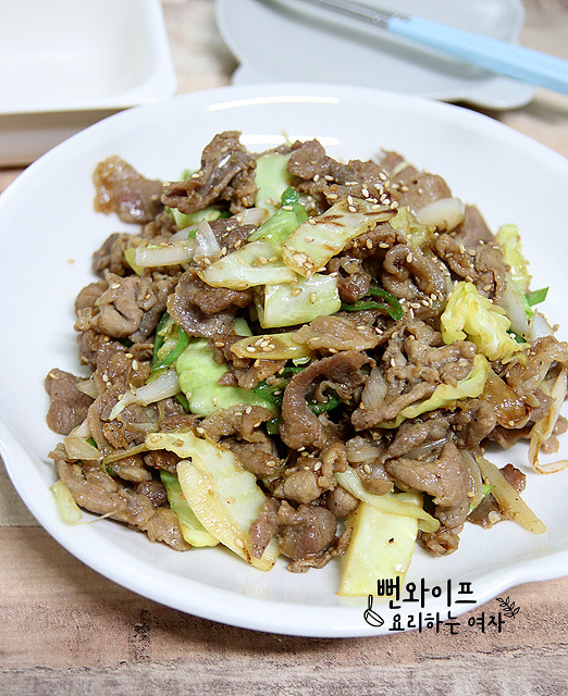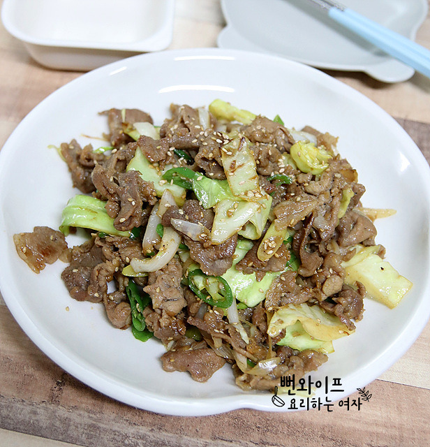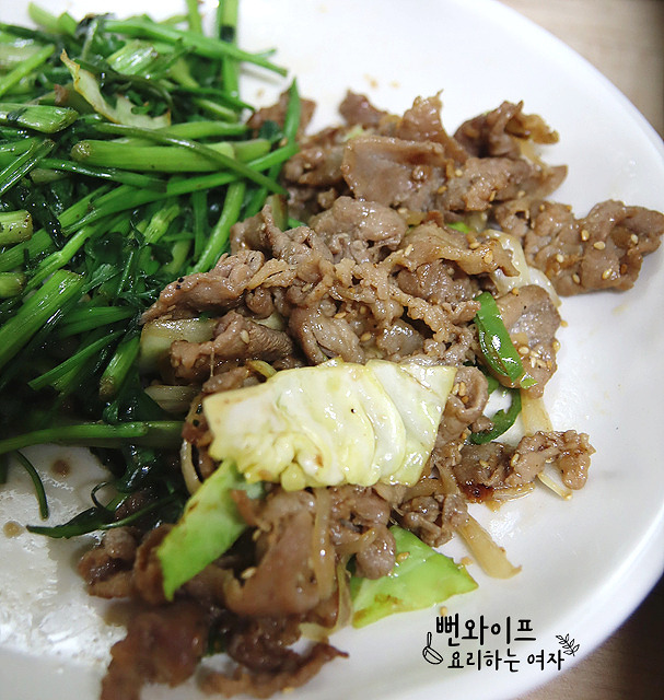 불고기 양념에 국물 없이 바싹 볶은 제육볶음인데요.