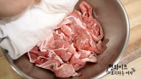 돼지고기는 키친타월로 꾹꾹 눌러서 핏물을 제거해서 누린내가 나지 않도록 합니다.