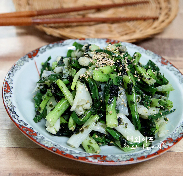 쪽파 살짝 데쳐서 여기에 고소한 김을 같이 넣고 무치면 꿀 조합 밥반찬이 됩니다.