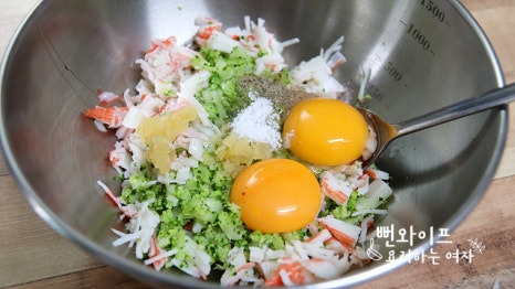 볼에 크래미와 브로콜리, 계란 2개, 다진 마늘 1/2큰술, 소금 1/4작은술, 후추 약간 넣고 섞어 줍니다.