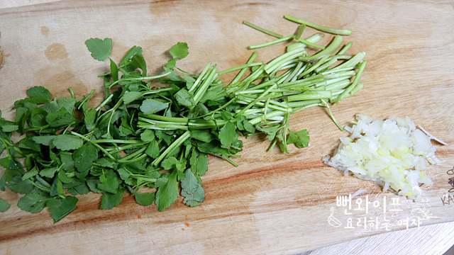 미나리는 콩나물과 비슷한 길이로 썰고 대파 잘게 다져 줍니다.