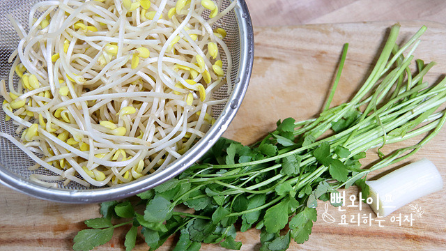 콩나물 씻어서 세줌 정도 미나리 반 줌, 대파 흰 대 조금 있으면 됩니다.