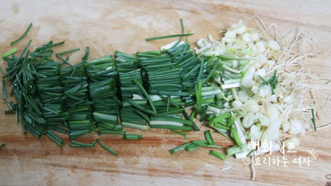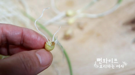 뿌리 쪽 알이 커서 씹기 부담스러우면 칼로 살짝 눌러서 잘게 썰고 나머지는 줄기 부분은 2~3cm 정도로 썰어 주세요.