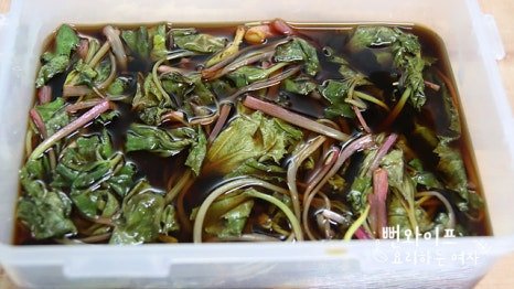 이렇게 팔팔 끓는 간장물 부으면 숨이 금방 죽고 부드러워집니다.