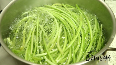 부드러워질 정도로만 데쳐 주고 냉수에 헹궈서 열기를 식힌 다음 물기 짜서 먹기 좋은 길이로 썰어 줍니다.