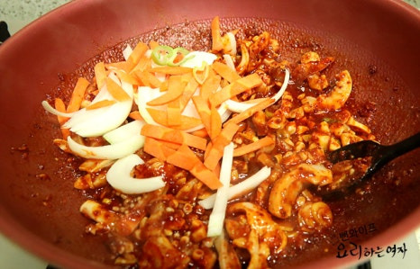 오징어를 넣고 고춧가루가 골고루 코팅 되도록 볶아 준 다음 섞어 둔 양념을 넣어 줍니다.