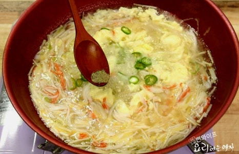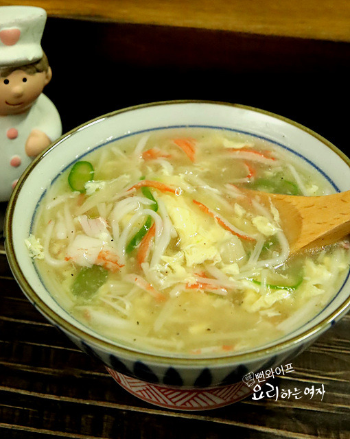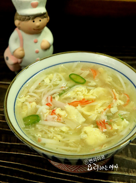 오늘은 한국식 계란탕 대신 게살 같은 크래미를 넣어서 국물을 부드럽게 만든 중국식 계란탕입니다.