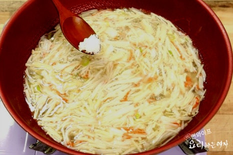 간을 보고 싱거우면 소금 약간 넣어서 맞추고 청양고추와 후추 약간 넣어서 마무리하면 됩니다.