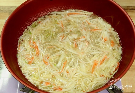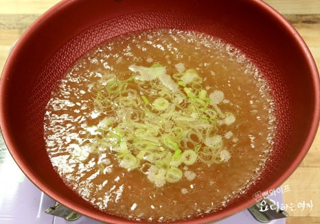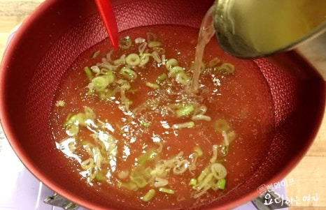멸치 육수 4컵 붓고 팔팔 끓여 주세요.