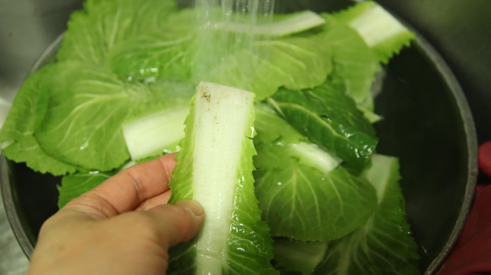 땅에 붙어서 자라기 때문에 줄기 부분에 흙이 많이 묻어 있어 한 장 한 장 꼼꼼하게 세척하는 게 중요합니다.