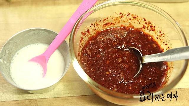 양념 재료 중 고춧가루 3큰술, 다진 마늘 1큰술, 참치액 2큰술, 굴소스 1큰술, 맛술 1큰술 넣고 섞어 주면 됩니다.
