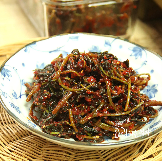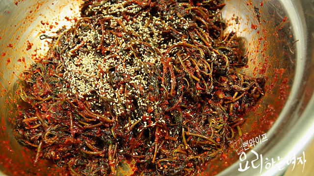 줄기 부분을 씹어서 간간하다 싶으면 물에 헹궈 주어야 양념했을 때 짜지 않게 간이 됩니다.