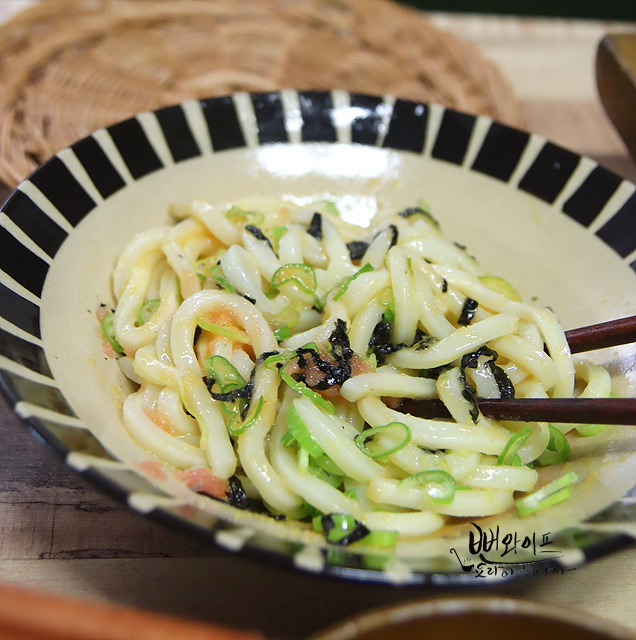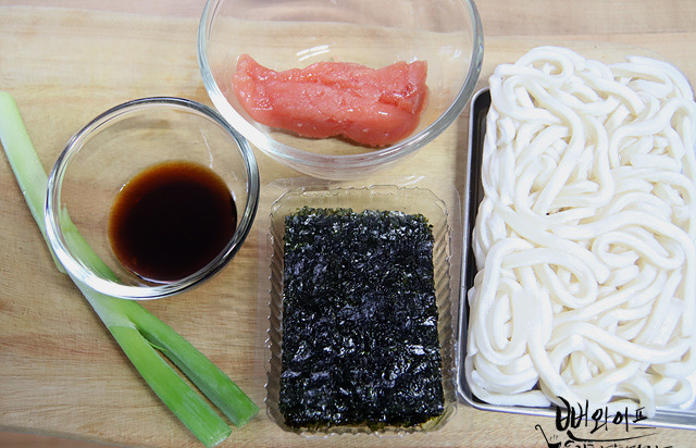 우동사리, 명란, 대파(=쪽파), 김, 쯔유...