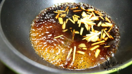 고등어 구운 팬을 닦은 후 물 5큰술, 진간장 2큰술, 맛술 2큰술, 조청 1큰술, 황설탕 1큰술, 생강 넣어서 바글바글 끓여서 생강 향이 우러나도록 합니다. 편으로 썬 마늘일 경우같이 넣고 끓여 주면 됩니다.