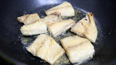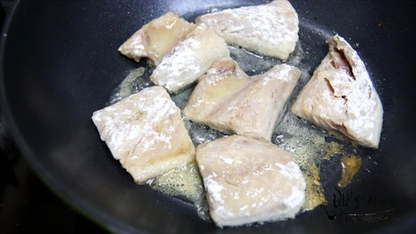 이렇게 전분이나 밀가루를 묻혀서 구워주면 조직이 단단해지면서 생선의 즙을 가두어 졸여놔도 살이 잘 부서지지 않고 촉촉하게 즐길 수 있어요.