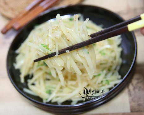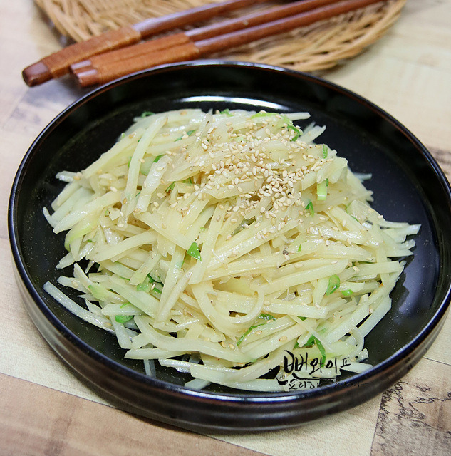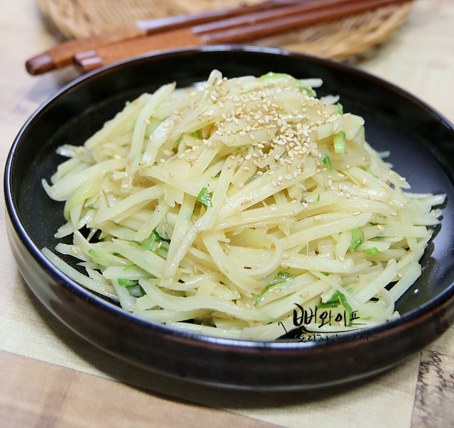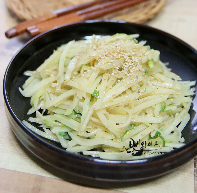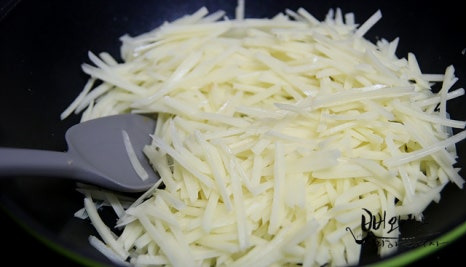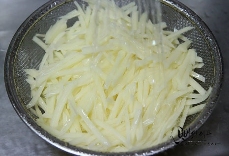 감자도 곱게 채 썰어서 물에 씻어 전분기를 빼준 다음 물기를 잘 제거해 줍니다.