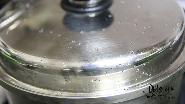 뚜껑 덮어서 불 세기를 강하게 한 다음 2~3분 정도 지나면 김이 폴폴 나기 시작합니다.