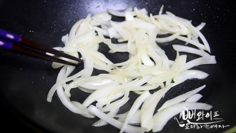 팬을 달구고 양파를 넣고 살짝 밑간이 되도록 소금도 두 세꼬집 정도 넣고 살짝 숨이 죽을 정도로 볶아 줍니다.