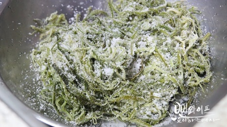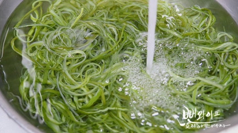 물에 여러 번 헹궜다가 물에 담가서 미역줄기에 남아 있는 염분기를 빼주어야 합니다.