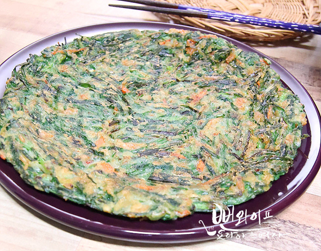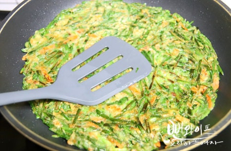 반죽 올릴 때 치익 하는 경쾌한 소리가 나야 기름을 덜먹고 바삭한 부침개를 부칠 수 있습니다.