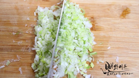 체에 밭쳐서 꾹꾹 눌러서 맑은 즙만 받아내고 대파는 잘게 다져 줍니다.