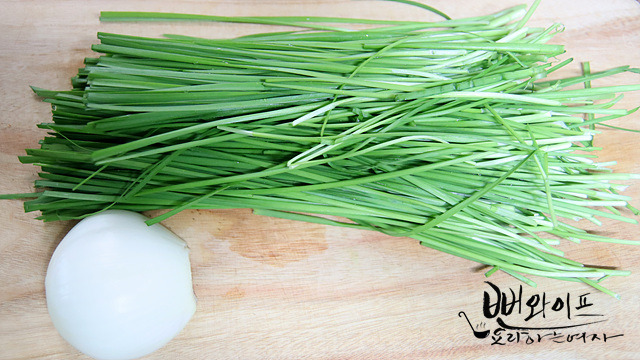 먹기 좋게 부추는 4~5cm 정도로 썰어 주고 양파는 곱게 채 썰어 주세요.