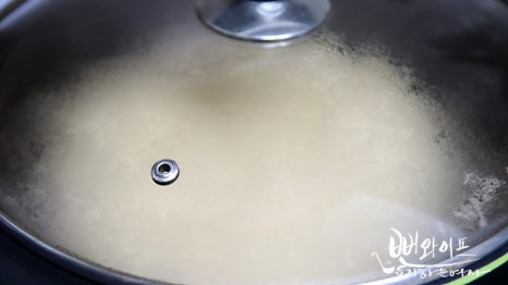 멸치육수나 물 4큰술은 넣고 뚜껑 덮어서 불을 약하게 해서 뜸을 들여줍니다.