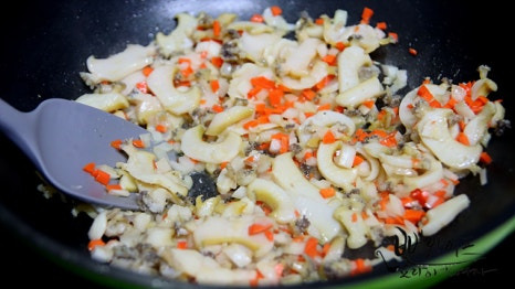 참기름 1큰술 두르고 전복과 야채를 넣고 달달 달 볶아서 익혀 줍니다.