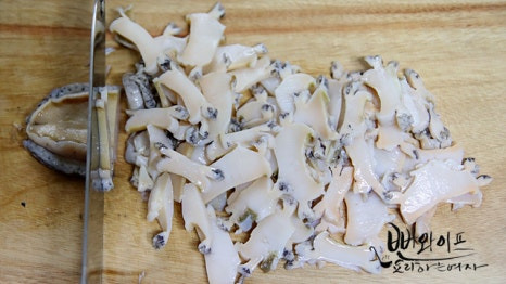 전복 내장은 모아서 가위나 칼로 잘게 잘라 줍니다.