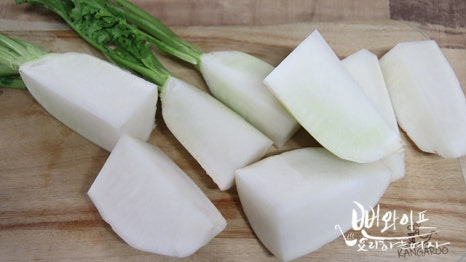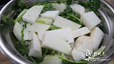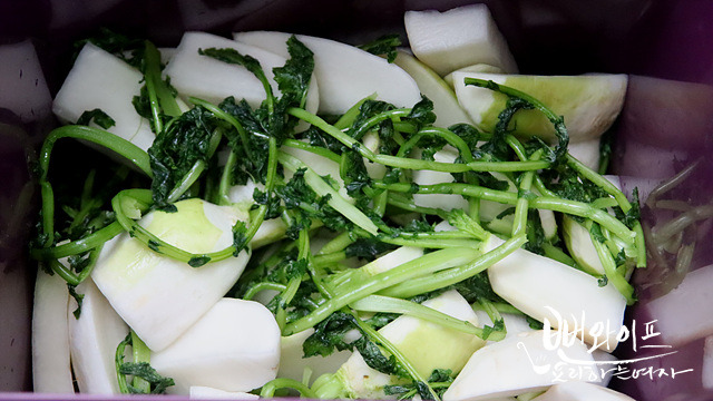 조직이 단단하고 섞박지 보다 굵고 크기 때문에 일반 깍두기나 섞박지 보다 시간을 늘려서 절여 주세요.
