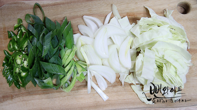 양배추와 양파는 씹히는 맛이 있도록 너무 가늘지 않게 썰어 주고 대파와 청양고추는 어슷 썰어 줍니다.