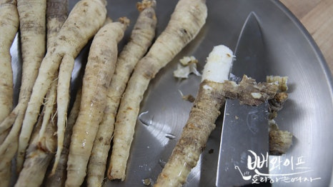 더덕이 크거나 껍질이 두꺼운 경우는 팔팔 끓는 물을 부어서 1분 정도 두었다가 냉수에 헹궈 준 다음 물기 빼고 손질하면 됩니다.