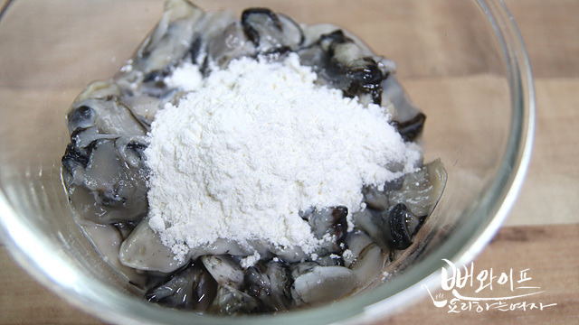 세척해서 물기 뺀 굴에 밀가루 3큰술을 넣고 섞어서 고루 밀가루 옷을 입혀 줍니다.