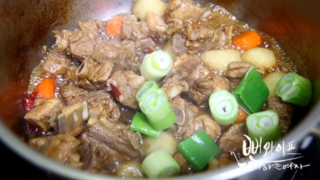 뚜껑 덮고 중~약불로 줄여서 고기가 부드럽게 익고 간이 배도록 20여 분 익혀줍니다.