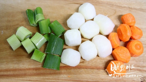 당근, 무, 대파, 베트남 고추인데요. 고추는 청양고추를 2개 하셔도 되고 양파도 큰 거 1/2개 정도 같이 준비해도 돼요.