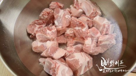 돼지갈비는 누린내 제거를 위해 냉수에 담가서 1시간 정도 물을 갈아가면서 핏물을 제거해 줍니다.