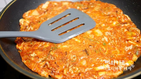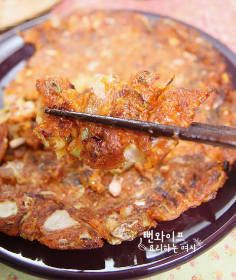 많이 시거나 묵은지로 부칠 때 부추나 양배추, 양파 등을 적절하게 넣어주면 훨씬 더 상큼하고 맛있게 즐길 수 있습니다.