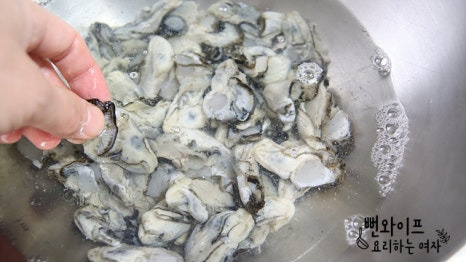 만들어 둔 소금물을 나눠서 2~3회 굴에 붙어 있는 굴 껍데기도 제거해 주면서 흔들어서 세척해 줍니다.
