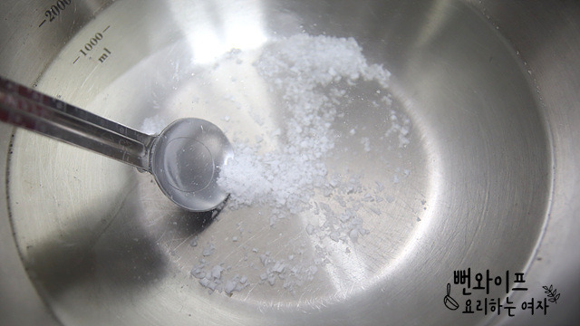 물 15컵 정도 받아 놓고 천일염 4큰술을 녹여서 소금물을 만들어 줍니다.