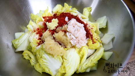 30분~1시간 정도 배추가 부드러워지면 수분만 버리고 헹구지 않습니다.