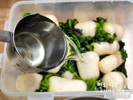 절인 알타리무를 전부 올리고 소금물을 부어 주세요.