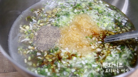 과일 간 거에 대파 넣고 다진 마늘 3큰술, 다진 생강 1/2큰술, 진간장 1컵, 맛술 1/2컵, 물엿 4큰술, 설탕 2큰술, 후추 1/2작은술, 참기름 2큰술, 물 2컵같이 넣어서 양념이 잘 어우러지도록 섞어 줍니다.