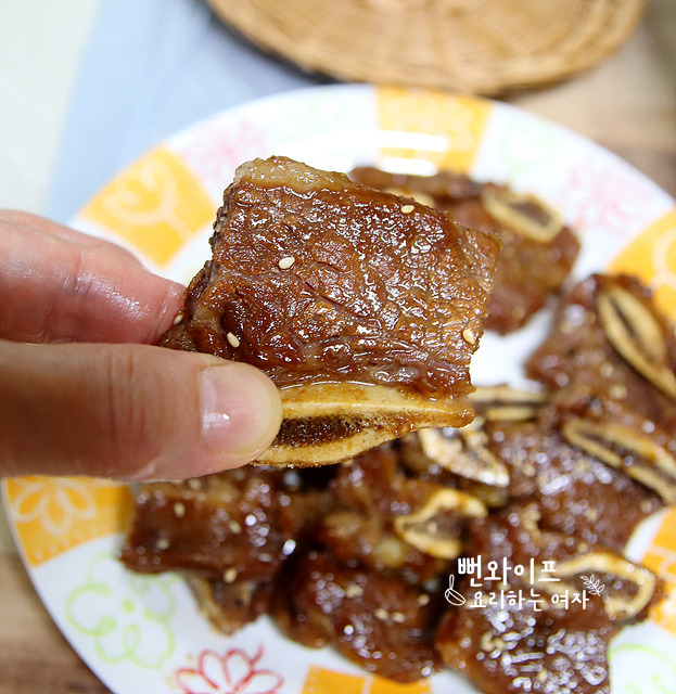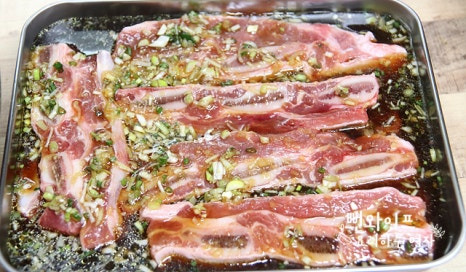 양념에 하룻밤 재워두면 고기 속까지 잘 배어드는데 중간에 위아래 위치를 한번 바꿔주면 좋아요.