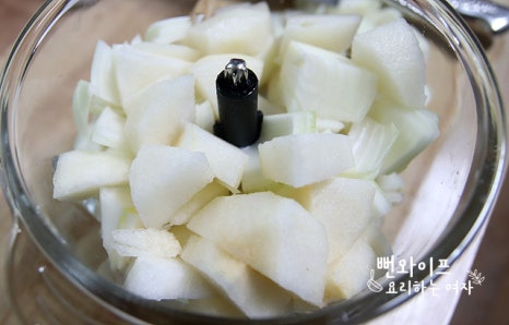 껍질 벗긴 배와 양파를 대충 썰어서 믹서기에 넣고 곱게 갈아 줍니다.