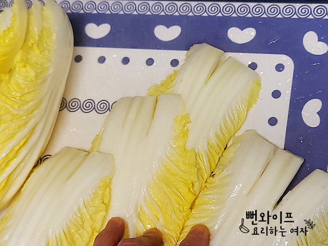 큰 배추는 두 개 작은 크기는 한 개 정도 칼집 넣어 주세요.
